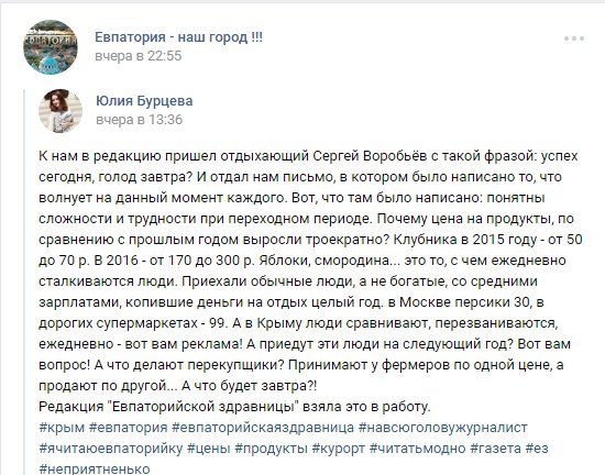 7) Приехали гости из Мурманска. В шоке от наших цен на фрукты. В мире что-то сломалось! Фрукты дешевле в Мурманске. В МУРМАНСКЕ!!! (прим. Дошло даже до того, что руссо-туристо ходит к местным пропагандистам и жалуется на цены, которые выросли троекратно, если сравнить хотя бы с 2015 годом.