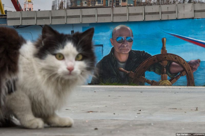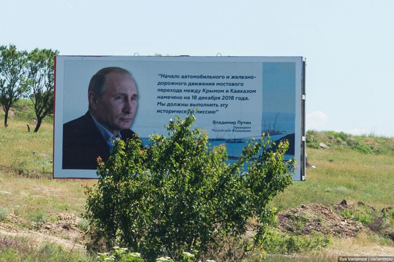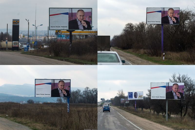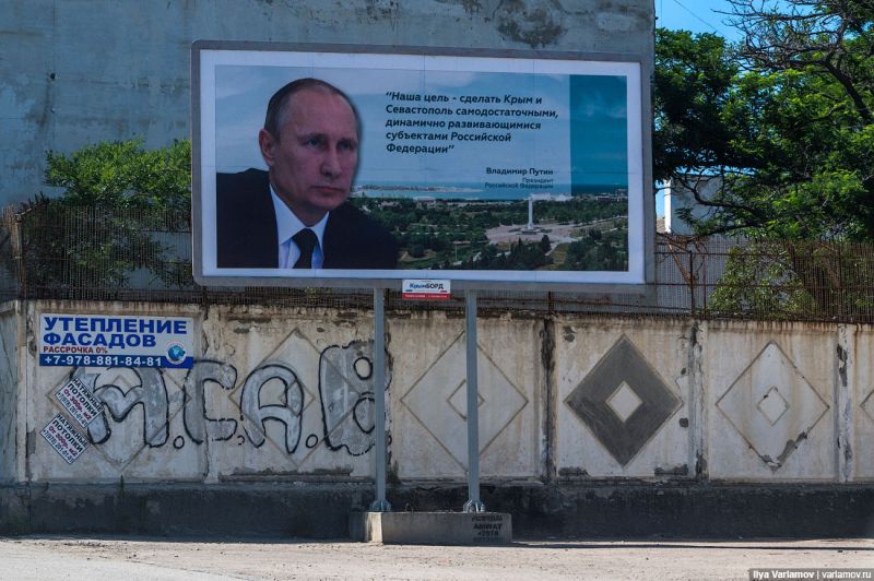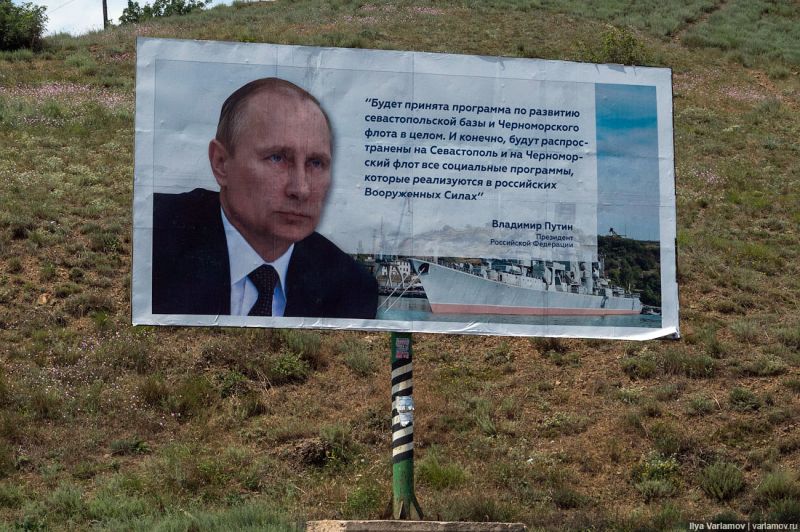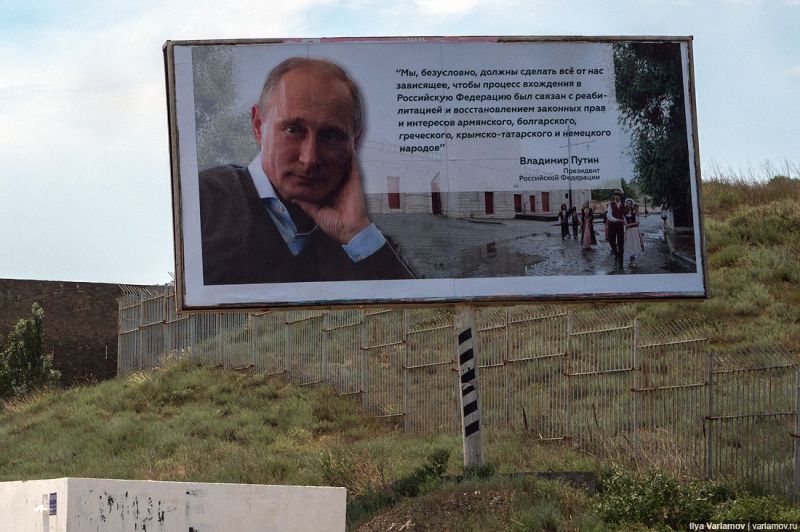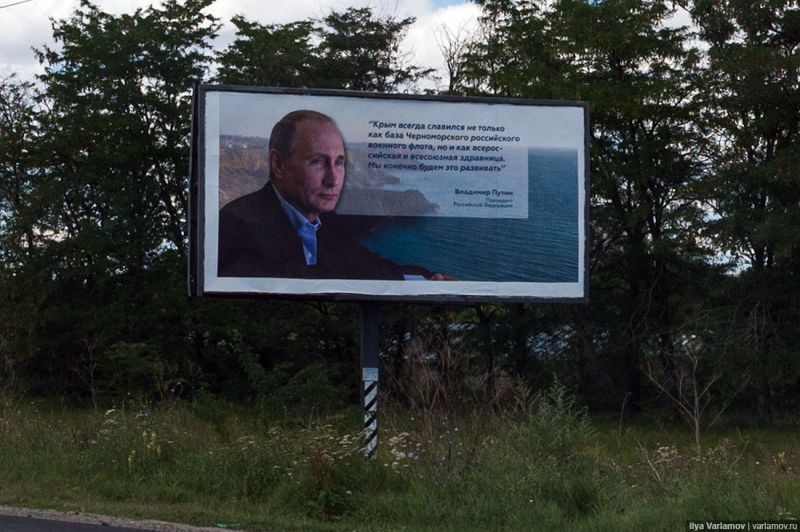 Даже Грозный с его многочисленными портретами вождей меркнет по сравнению с Крымом. На полуострове доброе и светлое лицо вождя смотрит на вас с многочисленных билбордов и плакатов. Повсюду мудрые и правильные слова.