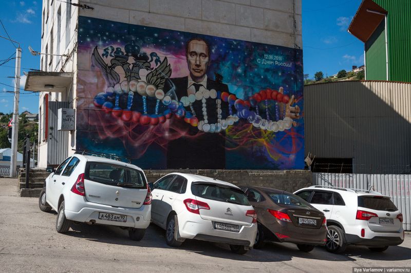Конечно, Путин - самый популярный герой патриотических муниципальных настенных росписей. Вот Ялта:
