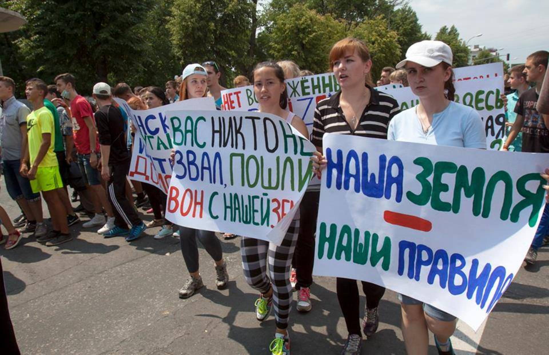 Окрім імітації сутичок, люди також мітингували за плакатами, на яких були надписи «Наша земля — наші правила», «вас сюди ніхто не звав», та інші.
