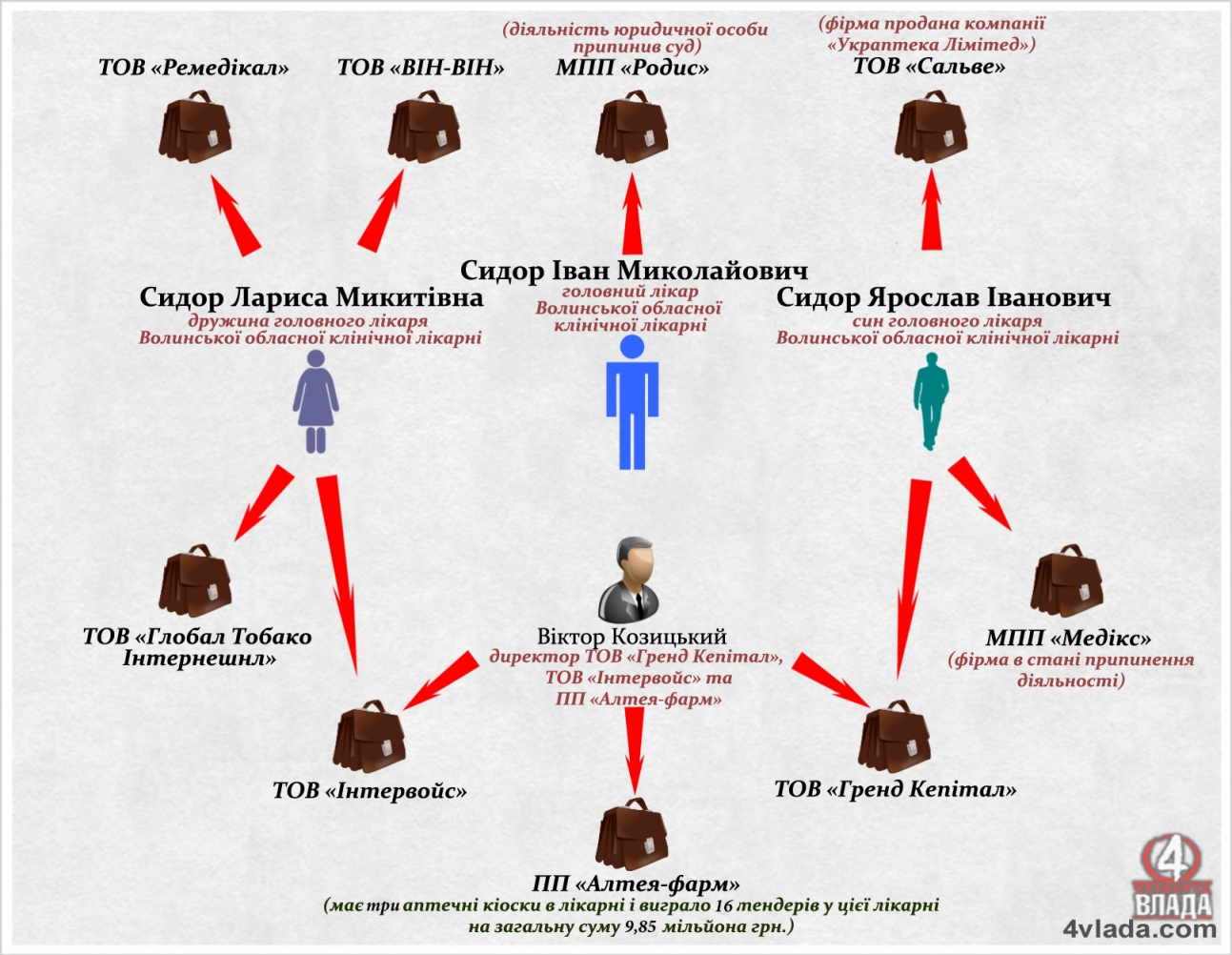 Тендер виграло Приватне підприємство «Алтея-фарм». Директор цього підприємства Віктор Козицький є директором також двох інших фірм ТОВ «Інтервойс» і ТОВ «Грендкепітал». В першій з них засновником є Лариса Сидор, а в іншій Ярослав Сидор. Це дружина і син головного лікаря Івана Сидора.