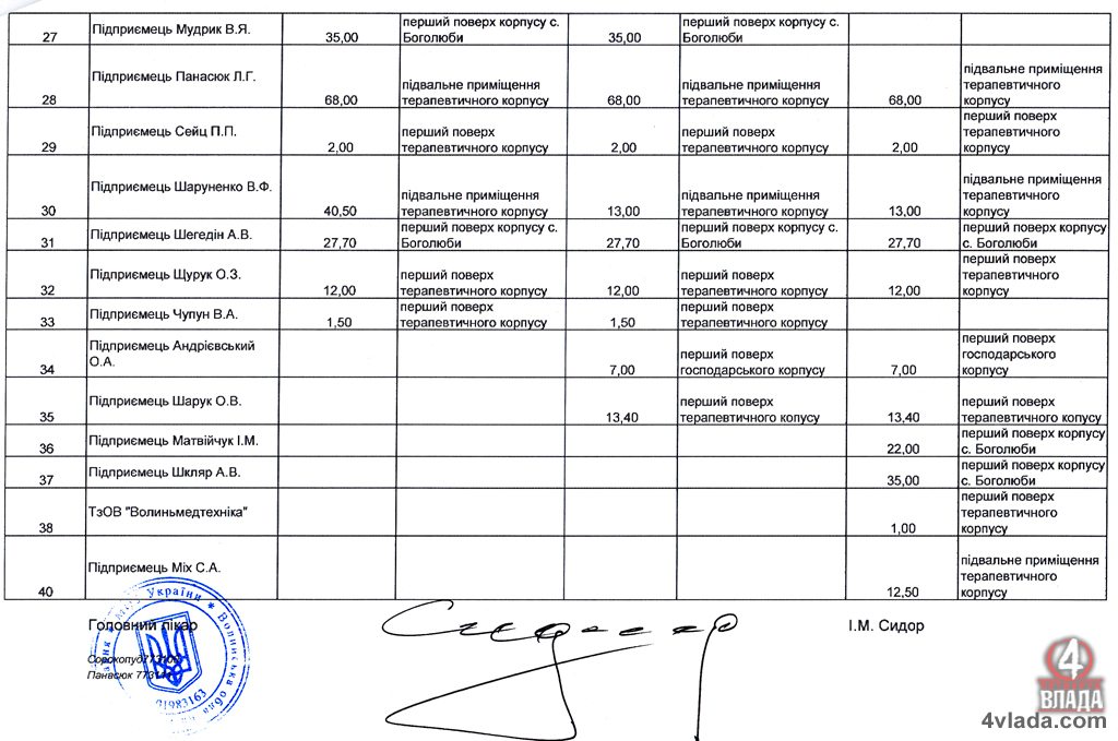 Орендарі приміщень в обласній лікарні (щоб збільшити натисніть мишкою):