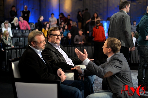 Последний одновременно с нами на своем Mini Cooper приехал к павильону спустя полчаса после начала эфира. Но если Евгения Алексеевича охрана быстро нашла в списке и проводила в студию, то нам с Мусей пришлось смотреть телемарафон в холле. Может, оно и к лучшему, потому что в просторных кожаных креслах было удобно наблюдать за происходящим на экране, а на столиках стояли ящики с очень вкусными яблоками. Кроме того здесь можно было стоять и ходить сколько угодно. В отличие от тех же студентов из массовки, которые за четыре часа эфира вставали лишь три раза по 3 минуты.