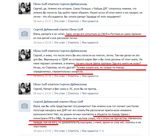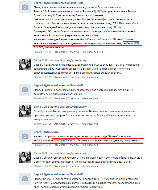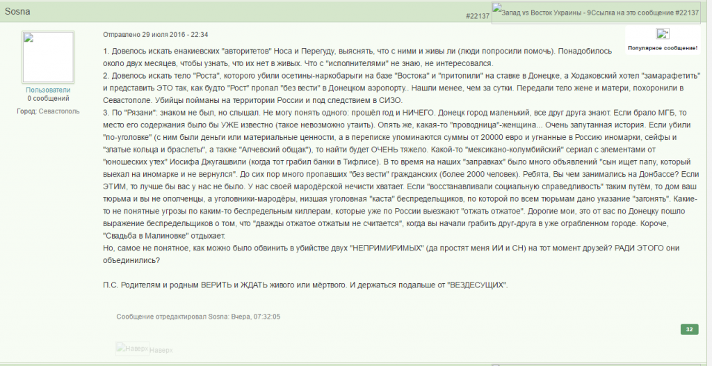 Кроме того, Казанский также приводит пост пользователя под ником Sosna– сторонника Стрелкова и "Хмурого", который в пылу переписки критикует Гилазова и параллельно раскрывает устрашающую картину реалий жизни на Донбассе.