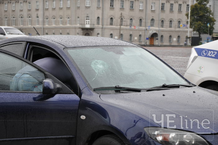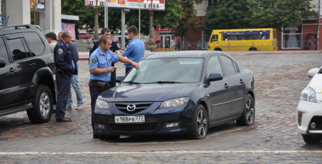 Инцидент произошел в центра города на Красной площади. Неизвестные разбили лобовое стекло и прокололи все шины в автомобиле марки «Мазда». Очевидцы говорят, что в машине висела георгиевская лента.