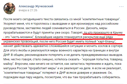 Однако, надежда не угасает. И вот уже российский боевик-ДНРовец Жучковский пишет, что «Россия планирует в ближайшие недели раскрытие ряда украинских провокаций» и после этого уже «мочить хохлов в сортире».