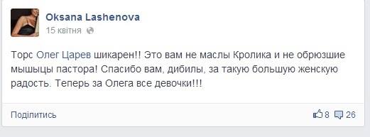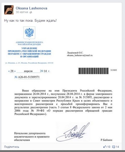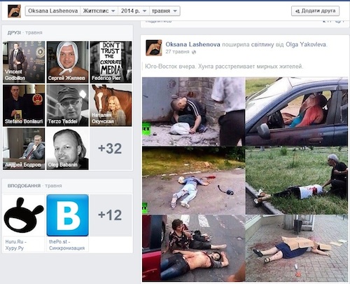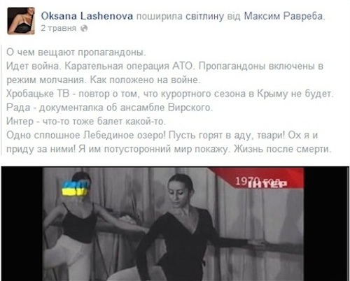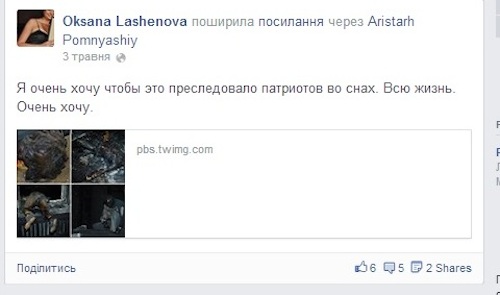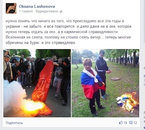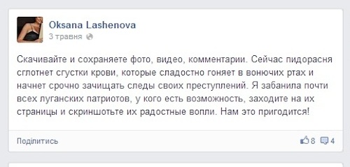 Я хорошо знаю Лащёнову, длительное время мы дружили и, видит Бог, я не желаю ей зла, несмотря на то, что в начале российской оккупации она выкладывала в сеть фотографии членов моей семьи, место их работы и наши адреса и даже несмотря на то, что она является одним из самых радикальных ненавистников Украины, которых я когда-либо встречал. Далее – небольшая подборка скриншотов из ФБ-профиля нашей героини: