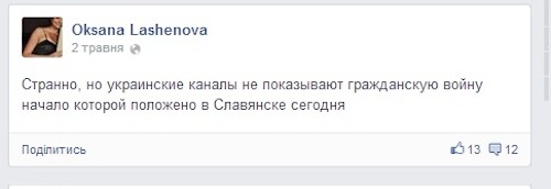 а я, в свою очередь, поставил об этом в известность начальника УМВД Украины в Луганской области Науменко А.В., чтобы исключить возможность Лащёновой информации о блок-постах и перемещении наших войск террористам. Не то чтобы я очень доверял милиции – скорее наборот, однако в данном случае я счёл необходимым поделиться с ними информацией, так как неконтролируемое перемещение столь враждебно настроенного по отношению к Украине человека, да еще и с мужем – сотрудником "Беркута", показалось мне просто неприемлемым. Науменко ответил, что все будет хорошо (он вообще оптимист по жизни), и на этом я окончательно стёр этого человека из своей памяти. Примерно на пару месяцев, пока сегодня не узнал о её задержании. Параллельно с этой информацией мне открылось еще несколько удивительных фактов. Как, например, тот, что, оказывается, за это время Лащёнова из провинциального Старобельска перебралась не в милые русскому сердцу Москву-Псков-Оренбург, а в... ненавистный бандеровский Киев, центр той самой "п...сни", и безболезненно мимикрировала к враждебной среде. По-моему, это неправильно. Мягко выражаясь.