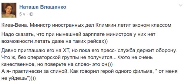 "Киев-Вена. Министр иностранных дел Климкин летит эконом классом. Надо сказать, что при нынешней зарплате министров у них нет возможности летать даже на таких рейсах", - написала она.
