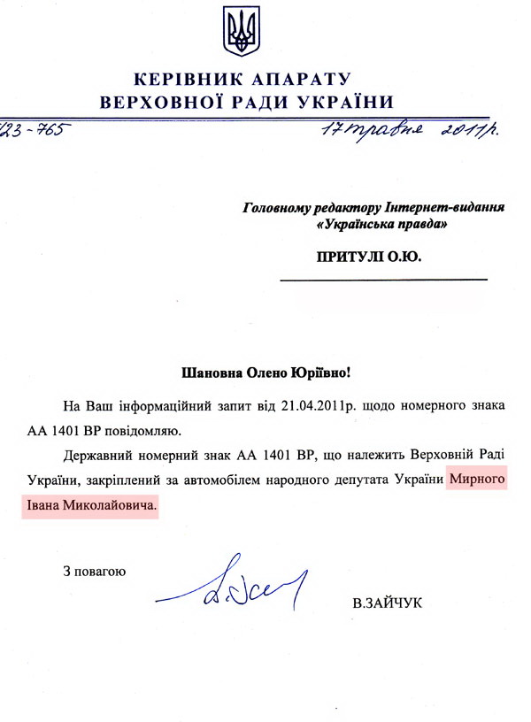 "Повідомляю, що питання здійснення обліку номерних знаків серії АА-ВР не віднесено до компетенції Апарату Верховної Ради України", - написав нам Зайчук на черговий запит.