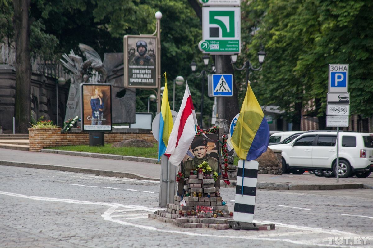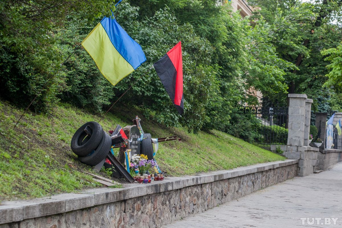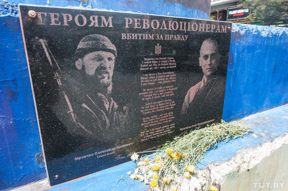 О Майдане напоминают лишь отдельные памятные знаки. Такими знаками на улице Грушевского отмечено место гибели белоруса Михаила Жизневского и Сергея Нигояна — первых погибших из «Небесной сотни».