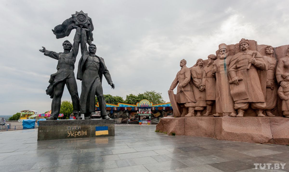 На бронзовой скульптуре, посвященной воссоединению украинского и русского народов, буквы сбиты, но текст читается. Поверх текста, судя по свежей краске, недавно кто-то нарисовал флаг Украины с традиционной надписью «Слава Украине».