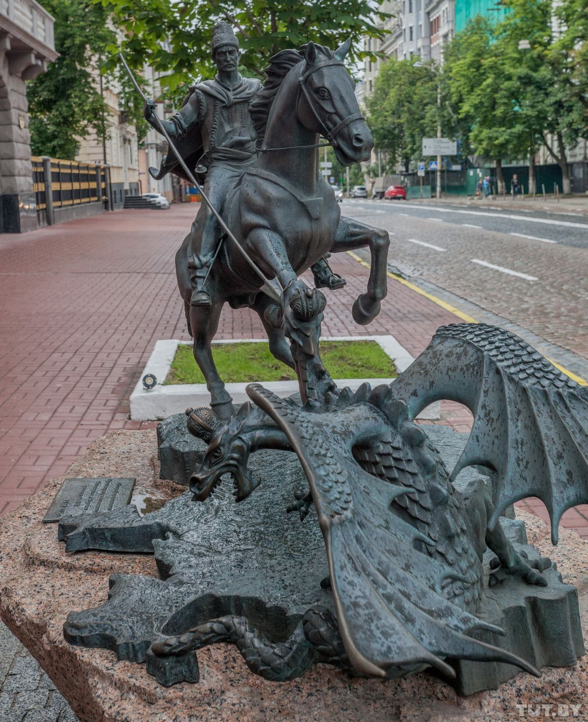 Около центрального здания СБУ 24 августа 2015 года появилась скульптурная композиция «Казак-победитель», посвященная защитникам независимости Украины — участникам АТО. На постаменте в виде контуров Украины казак на коне, похожий на Георгия Победоносца, копьем поражает дракона или крылатого змея, вцепившегося в Украину в районе Донбасса. На голове зверя корона, а в руках — скипетр с еще одной короной.