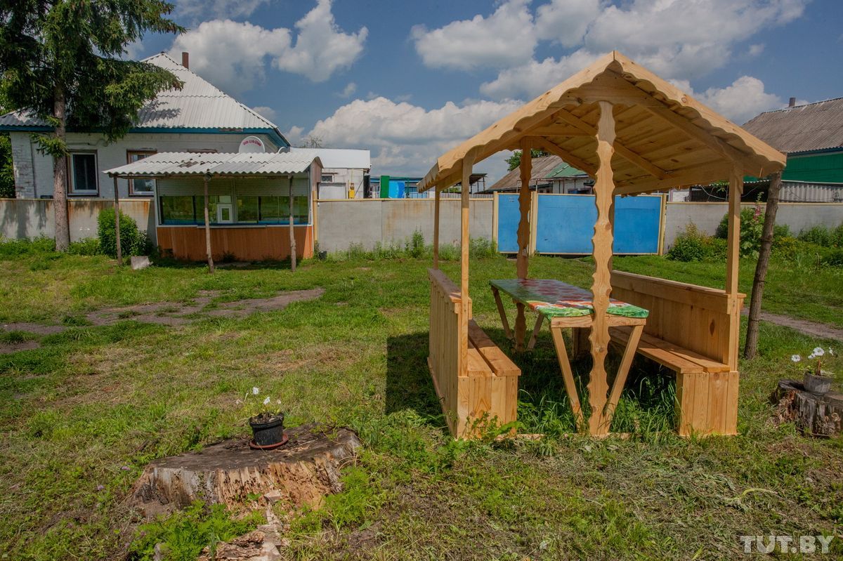Перед деревенским домом — беседка со столом. Рядом — киоск-магазин. Хозяйка приглашает нас во двор помыть руки из умывальника с «носиком». Интересуется, где мы желаем обедать, в доме или в беседке. Выбираем беседку. Порции были большие и вкусные. Подавала их хозяйка в домашней посуде. Два борща, одно картофельное пюре с соусом, две порции блинчиков с творогом и сметаной, два чая обошлись в 2,5 доллара.