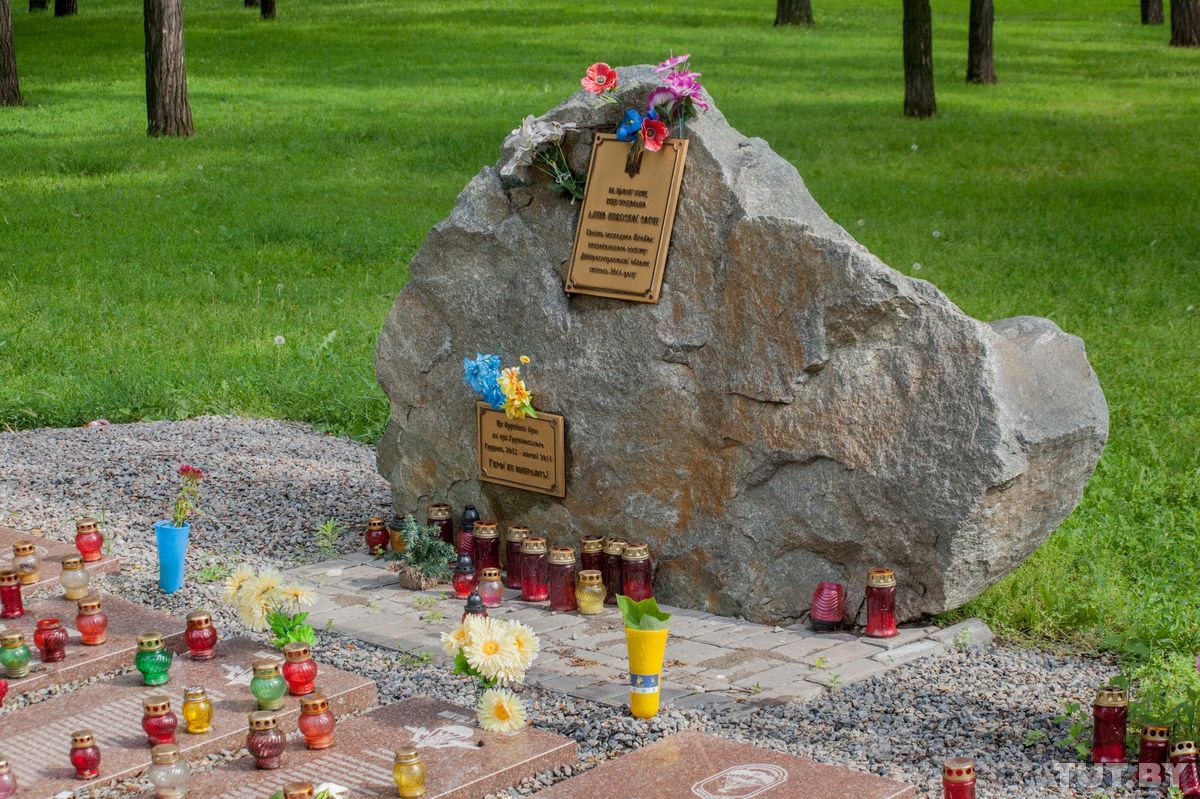 Около этих знаков — свечи-лампады, цветы, флаги, в том числе и «бел-чырвона-белы».