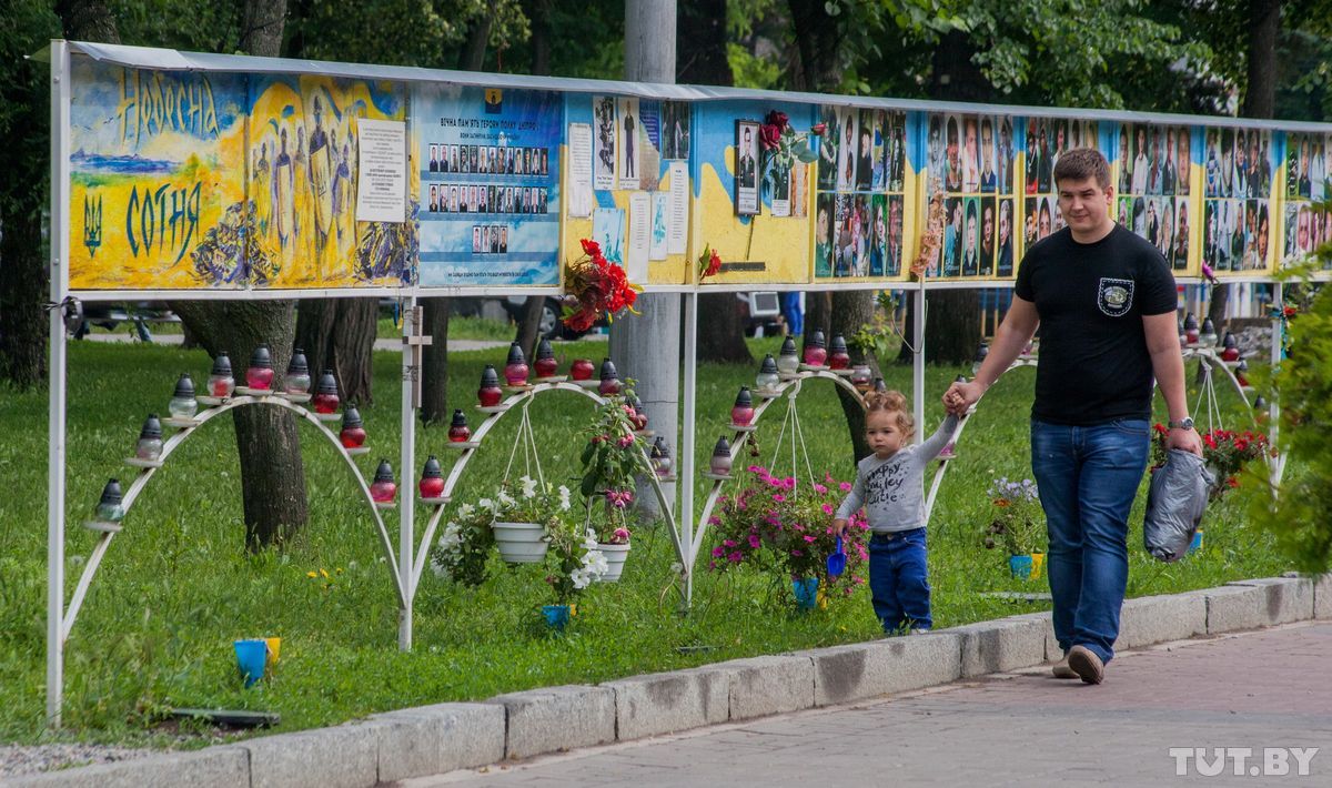 На камне табличка информирует, что здесь будет заложена аллея Небесной сотни. Поблизости вдоль пешеходной дорожки протянулся длинный стенд с фотографиями Небесной сотни и погибших в АТО.