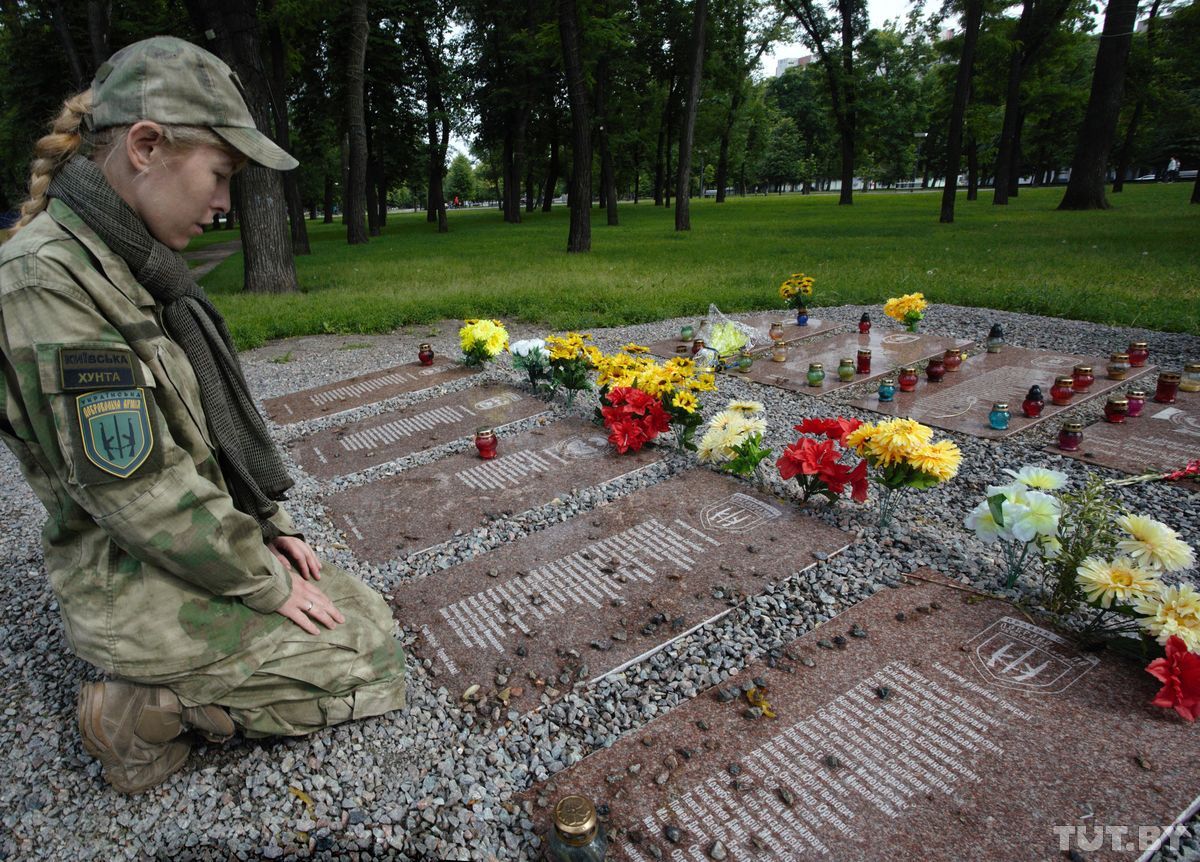 Рядом с камнем — православный крест. А на земле — гранитные плиты с длинными списками имен бойцов, погибших в АТО. Каждая плита имеет символику подразделения, где служили погибшие. На некоторых плитах список небольшой — много свободного места. А для погибших бойцов ДУК «Правый сектор» одной плиты оказалось мало — две плиты почти полностью заполнены фамилиями.