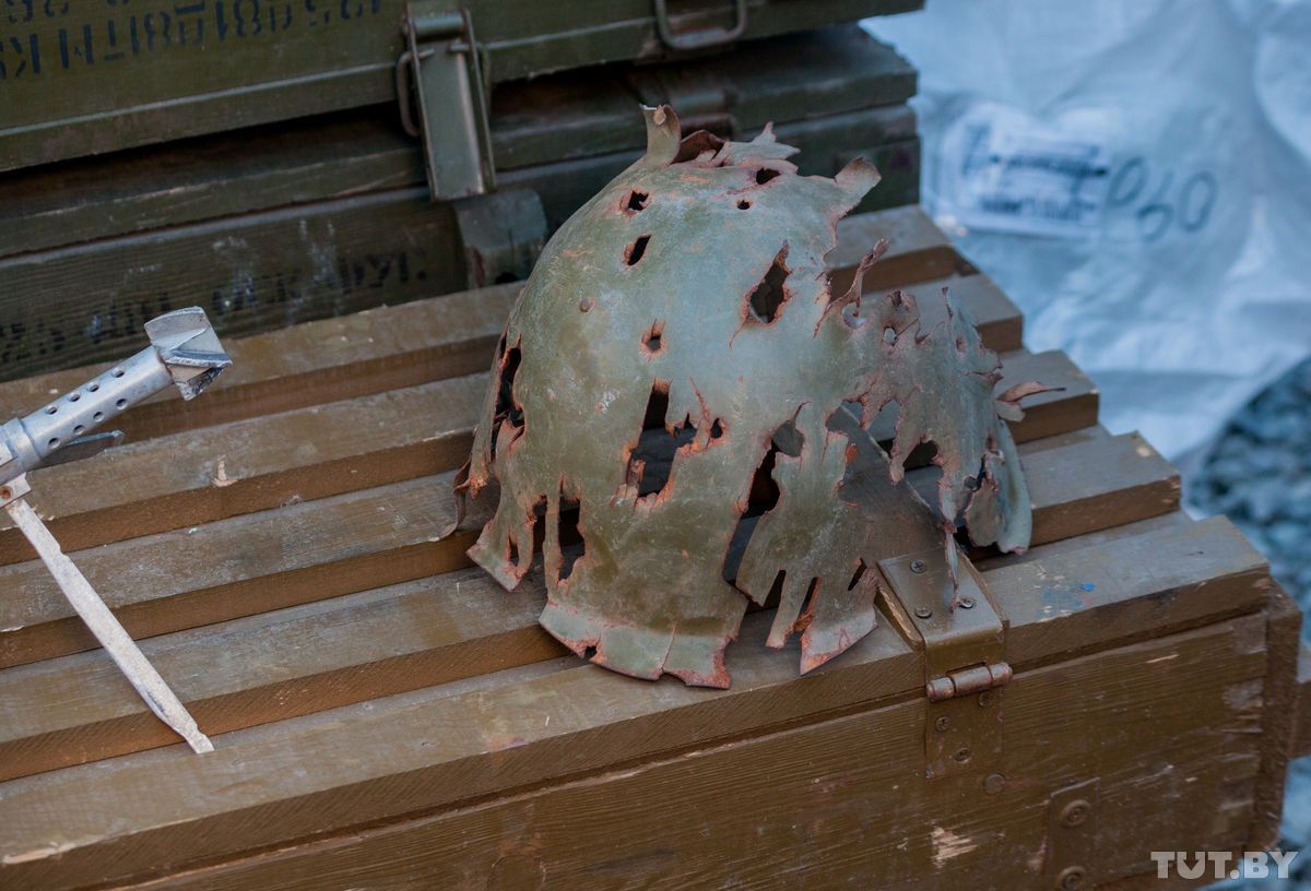 Впечатляет пробитая осколками до состояния решета стальная армейская каска.