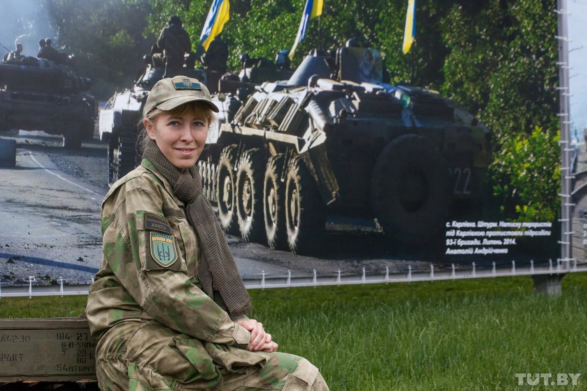 Елена просит сфотографировать ее на фоне стенда с фотографией солдат с бронетехникой. На стенде написано: «с. Карловка. Штурм. Натиску террористов под Карловкой противостояли подразделения 93-й бригады. Июль 2014».