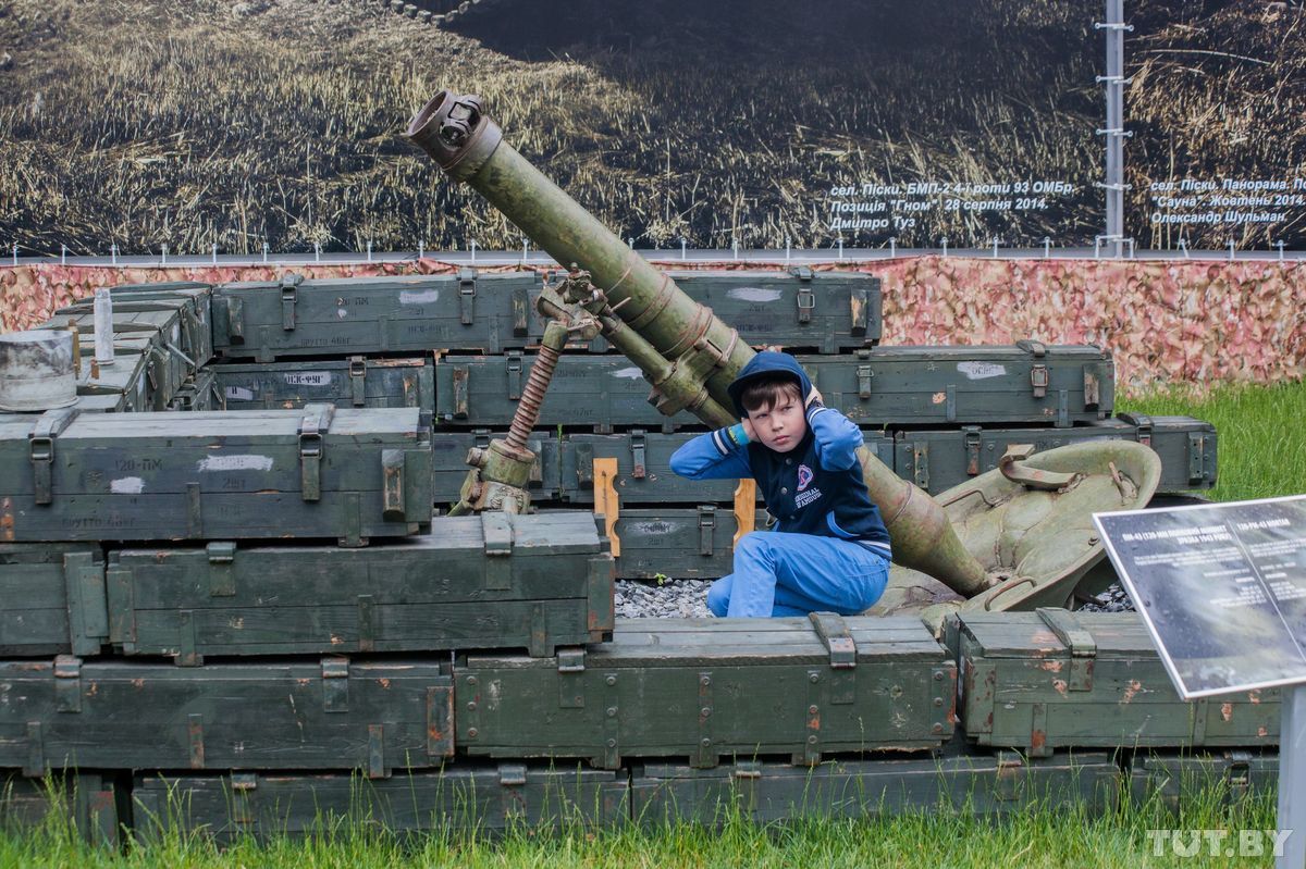 Выставка насчитывает 400 экспонатов. Среди них — реальные вещи с Донбасса: поврежденная военная техника, снаряды и простреленные дорожные знаки.