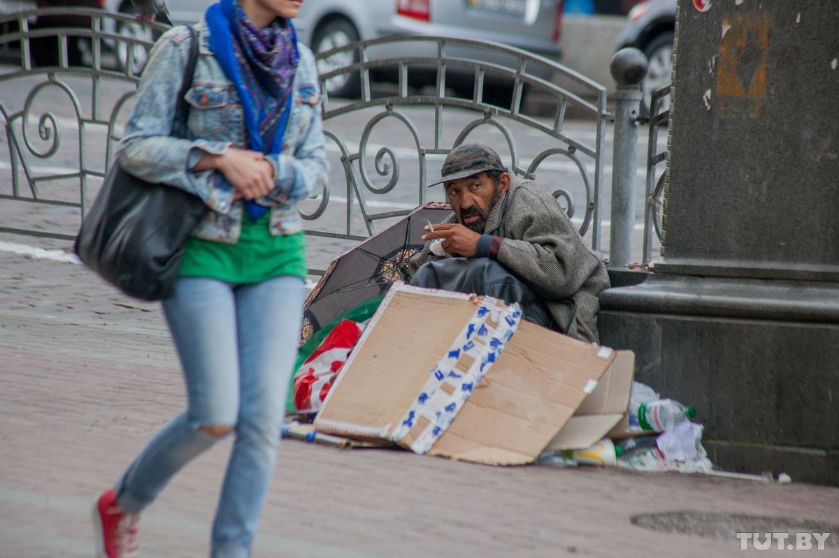 Отдыхающие на тротуаре бомжи в центре города и витрина с «Роллс-Ройсами».