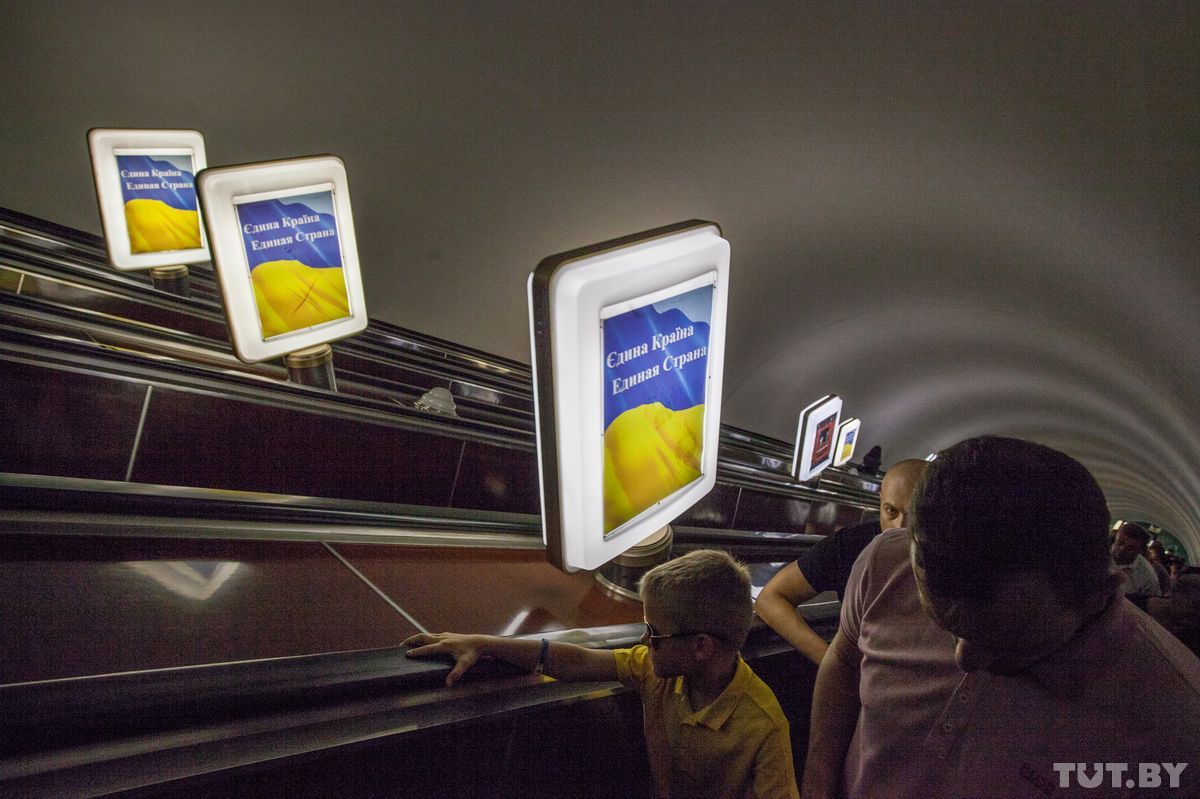 Балюстраду эскалаторов метро во множестве украшают светящиеся шильды с флагом Украины и надписями на украинском и русском языках — «Единая страна».