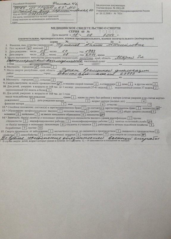 Вещи, паспорт и военный билет младшего сержанта Антона Туманова матери еще не отдали. 20 августа Елена Петровна получила только гроб и копию свидетельства о смерти из ростовского морга. Там указана дата смерти — 13 августа 2014 года, место — «Пункт временной дислокации войсковой части 27777», время — «Во время исполнения обязанностей военной службы», и причина — «Сочетанная травма. Множественные осколочные ранения нижних конечностей с повреждением крупных кровеносных сосудов. Острая массивная кровопотеря».