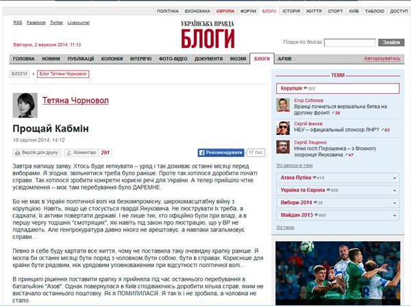Как сообщают источники в правительственных кулуарах, причиной, побудившей Черновол написать заявление, стало недовольство первых лиц государства, вызванное появлением в ее блоге на «УП» поста с резкой критикой нынешней власти.