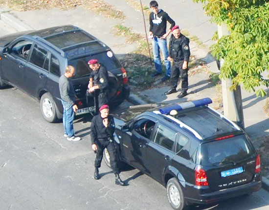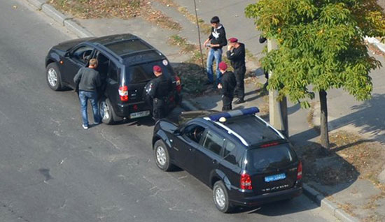 Киевлянин Сергей Строй опубликовал фотографии, как сегодня, 4 октября 2016 года, экс-сотрудники "Беркута" на патруле гн 1580 остановили автомобиль гн АА7195ОР и провели обыск как самого автомобиля, так и водителя с пассажиром. Все происходило на перекрестке Алишера Навои и Перова.