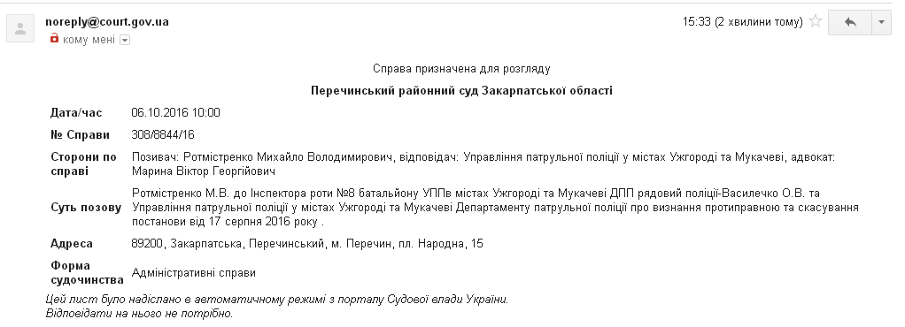 Так, в Перечинському райсуді під головуванням судді Амаровича В.П. буде розглядатися адміністративний позов судді Ужгородського міськрайонного суду Ротмістренко М.В. до Інспектора роти №8 батальйону Управління патрульної поліції у містах Ужгороді та Мукачеві рядового поліції Василечко О.В. про визнання протиправною та скасування постанови від 17 серпня 2016 року про керування автомобілем в стані алкогольного сп’яніння. Відтак, умовну назву дана судова справа буде мати "Суддя Ротмістренко проти Нова Поліція".
