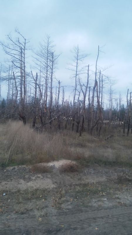 3) "Разводя войска мы уменьшаем количество обстрелов". Полная ерунда. Артобстрелы в случае "разведения войск" будут идти и по находящемуся рядом населенному пункту Валуйское и по той же больнице, которая неизвестно почему очутилась прямо на краю предполагаемого места "новых позиций". Об обстреле градами можно вообще умолчать. На фото пейзаж вокруг блокпоста "Сталинград" . Эти деревья сломал не Тунгусский метеорит - это работали грады.