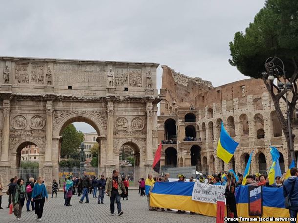Как стало известно «фрАзе», под стенами Колизея и у арки Константина собрались полсотни активистов украинского общества с антивоенными лозунгами и национальной символикой.