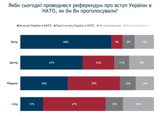 В частности, на вопрос "Если бы сегодня проводился референдум о вступлении Украины в НАТО, как бы Вы проголосовали?" утвердительно ответили 43% респондентов, 29% – высказались против интеграции в Альянс, 11% - не принимали бы участие в голосовании.
