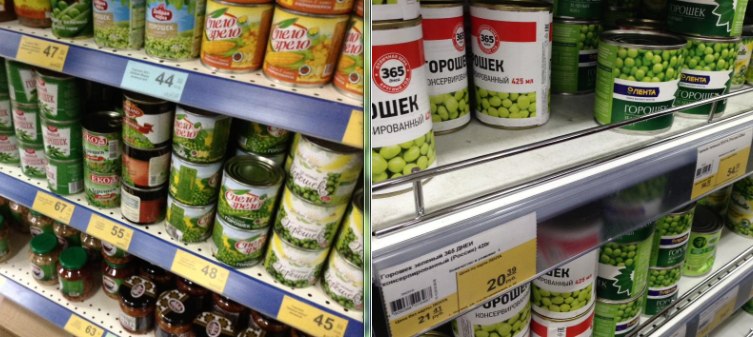 Горошек и кукуруза стоят примерно одинаково. Единственное, ценовой разброс «Ленты» гораздо шире. Здесь, например, можно взять вполне приличный горошек собственного производства супермаркета (как «Aro» у ТЦ Метро) за 20 рублей. В среднем севастопольский ценник попадает в диапазон 36-70 рублей, московский 20-55. Кстати, последняя цифра и там, и там — это абсолютно одинаковые банки горошка«Бондюэль».