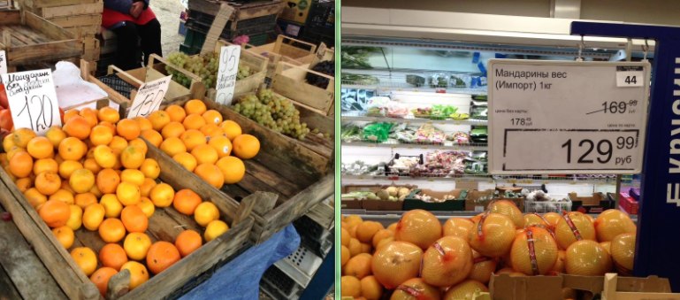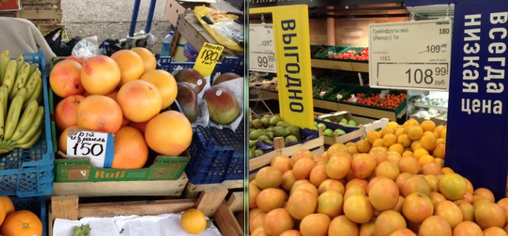 Московские цены взяты в одном из супермаркетов сети «Лента» на ВДНХ рядом с телецентром «Останкино», севастопольские — на рынке «Чайка» и супермаркете «ПУД».