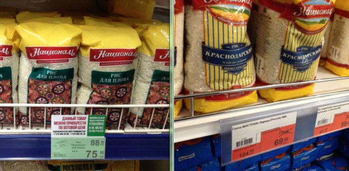 К слову о логистике: обратите внимание на правое фото: рис из «Ленты» краснодарский. В Севастополе также краснодарский рис. Вот он. 110 рублей.
