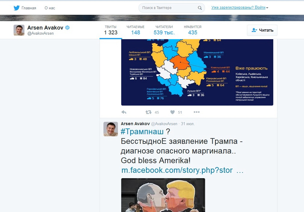 Ранее на странице Арсена Авакова был опубликован пост, в котором украинский министр называл американского кандидата в президенты "опасным маргиналом". "И опасен он как для Украины, так и для США в такой же степени. Не может маргинал, потакающий диктатуре Путина быть гарантом демократических свобод в США и мире.. Не зря Манафорт раньше возглавлял штаб Януковича, а сейчас Трампа. Янукович через Крым сбежал в Россию. Куда Манафорт приведет Трампа?", - написал Аваков, дополнив свой пост "графическим" поцелуем между Трампом и Путиным.