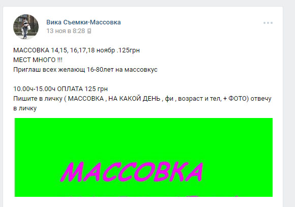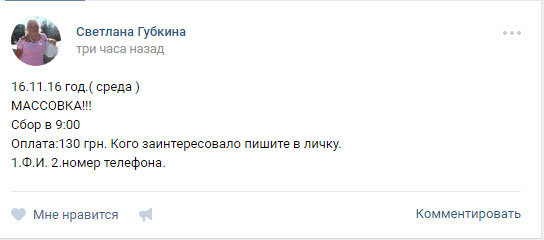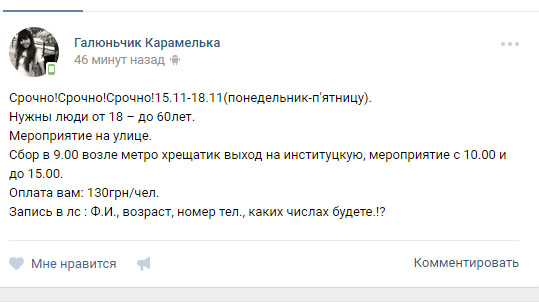 "Захід – на вулиці. Потрібні люди від 18-80 років. Збір в 9-й ранку біля метро "Хрещатик", вихід на Інститутську. Захід з 10 -15. Пишіть в лічку", - приблизно такий зміст всіх опублікованих оголошень.