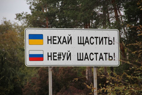 Дорожный знак у блокпоста на въезде в город Счастье (Луганская область)