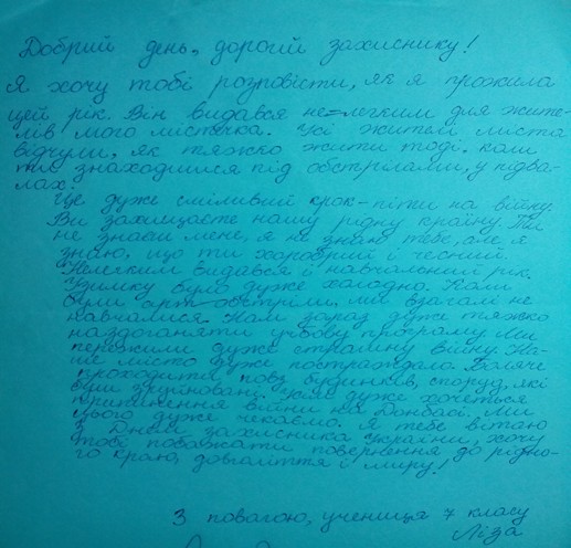 Видимо, все эти чувства изложила Лиза Храпко из Марьинки в своем письме к украинскому бойцу, которое попросила опубликовать. Вот строки из него: