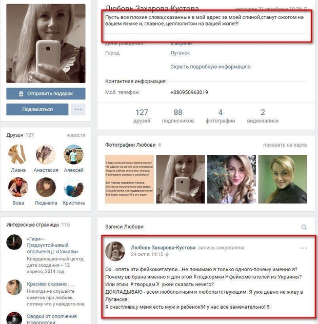 "Решил поднять вам настроение перед сном. Любовница террориста моторолы Любовь Захарова-Кустова обвиняет украинских хактивистов из Украинского киберальянса в "фейкометательстве". Что ж, заступлюсь за ребят, так как на днях волонтеры разведчики сообщества InformNapalm получили от них для анализа полный дамп телефона террориста. Возможно несколько скриншотов переписки в Вайбере и фотографий с телефона освежит Любину память", - отметил волонтер.