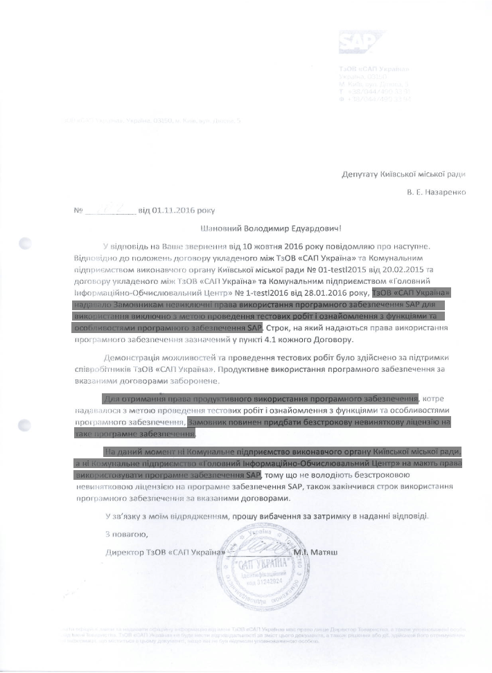 Вероятно, поэтому, впоследствии представитель GIZ в Украине Руслана Ярченко инсинуации Назарова однозначно пресекла. В конечном результате  ООО “SAP Украина” 1 ноября 2016 года официально запретило КГГА дальнейшее пользование демо-версией SAP без приобретения лицензии на ПО.