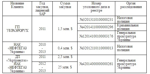 Перечень уголовных дел, расследуемых по результатам поставок продуктов “SAP Украина”
