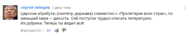 "Царские атрибуты (скипетр, держава) совместно с "Пролетарии всех стран", по меньшей мере — дикость. Сей поступок трудно описать литературно. Из рубрики: Теперь ты видел все!??" - отметил Сергей Лебедев.