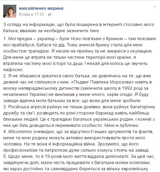 Сама Марина Михайленко, комментируя информацию о том, что отец получил российскую награду за аннексию Крыма, написала на своей странице в Facebook: "Мои предки – украинцы – были тесно связаны с Крымом – там похоронены мои прабабушка, бабушка и дед. Поэтому аннексия Крыма стала для меня личной трагедией. Я никогда не приму и не смирюсь с оккупацией. Для меня это потеря не только части территории моей страны, я потеряла часть моей истории и души".