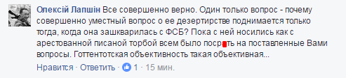 "Все совершенно верно. Один только вопрос – почему совершенно уместный вопрос о ее дезертирстве поднимается только тогда, когда она зашкварилась с ФСБ? Пока с ней носились, как с арестованной писаной торбой всем было поср*ть на поставленные Вами вопросы", – пишет Олексій Лапшін.