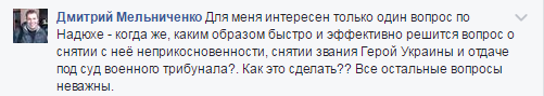 "Для меня интересен только один вопрос по Надюхе – когда же, каким образом быстро и эффективно решится вопрос о снятии с нее неприкосновенности, снятии звания Герой Украины и отдаче под суд военного трибунала? Как это сделать? Все остальные вопросы неважны", – заявил Дмитрий Мельниченко.