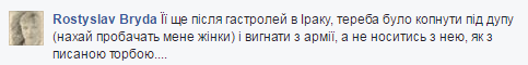 "Ее еще после гастролей в Ираке, нужно было копнуть под задницу и выгнать из армии, а не носиться с ней, как с писаной торбой", – резюмировал Rostyslav Bryda.
