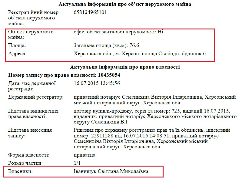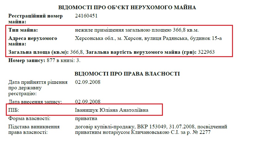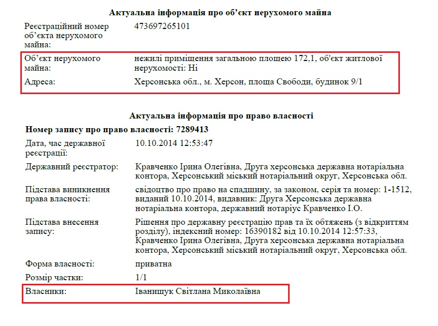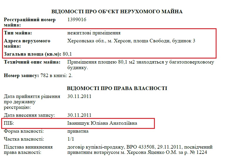 У власності пані Іванищук також є два нежитлових приміщення в центрі Херсону площею 80 та 366м².