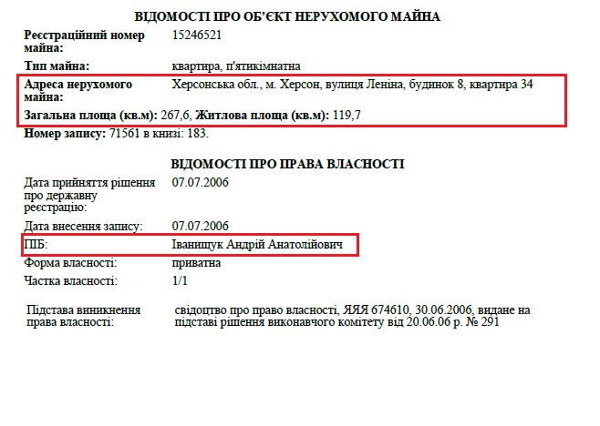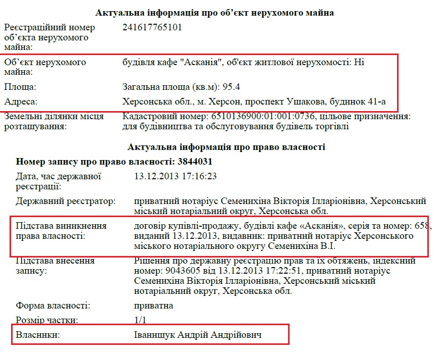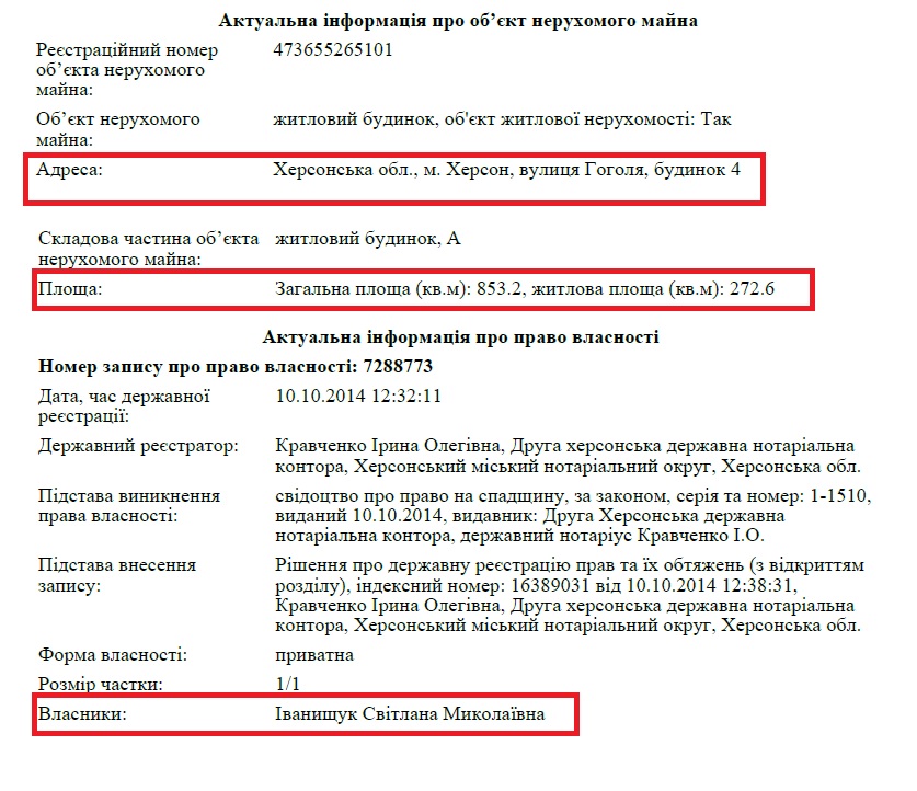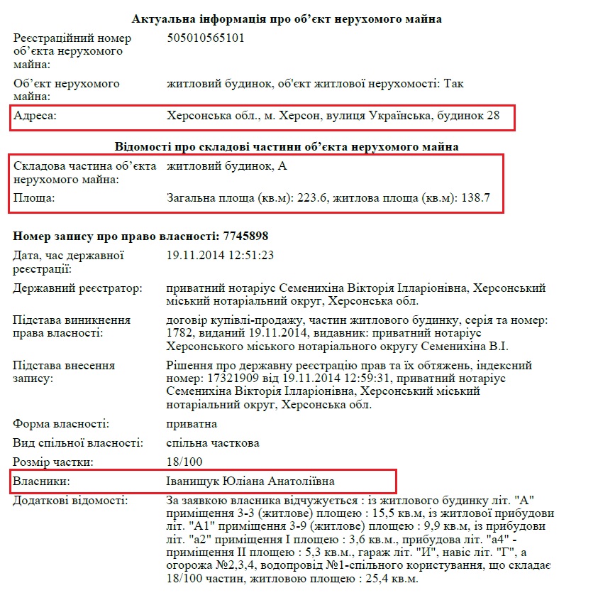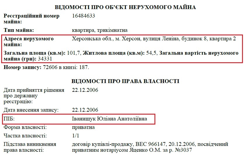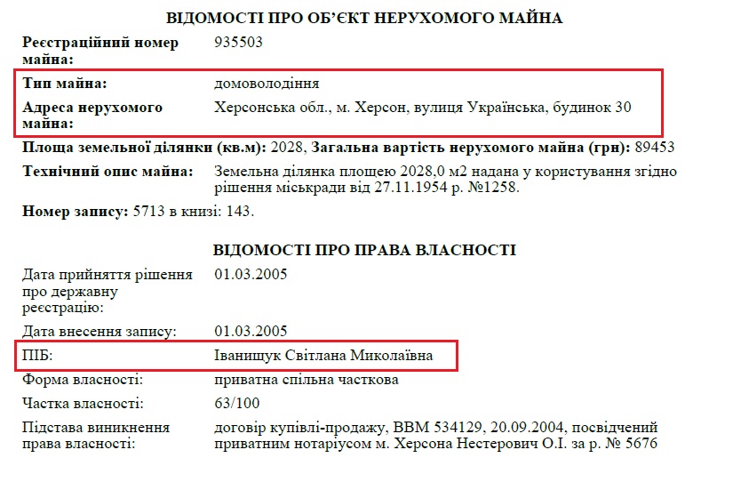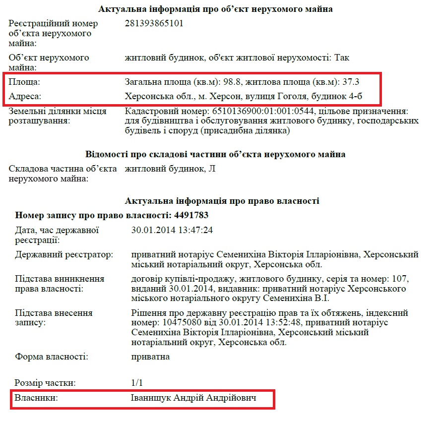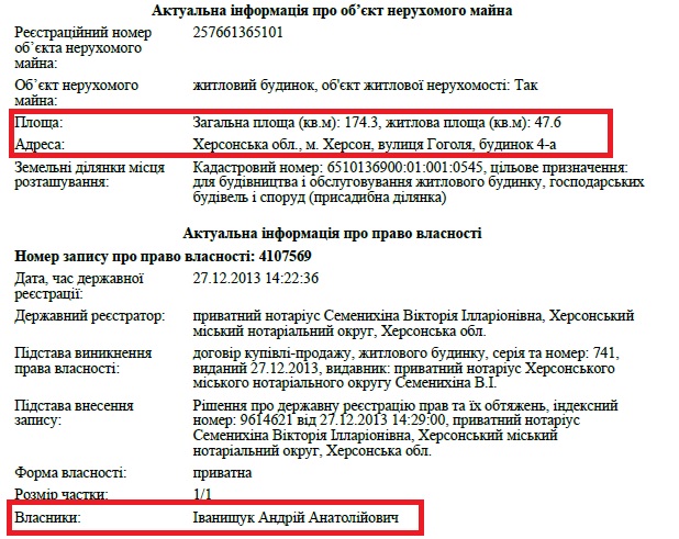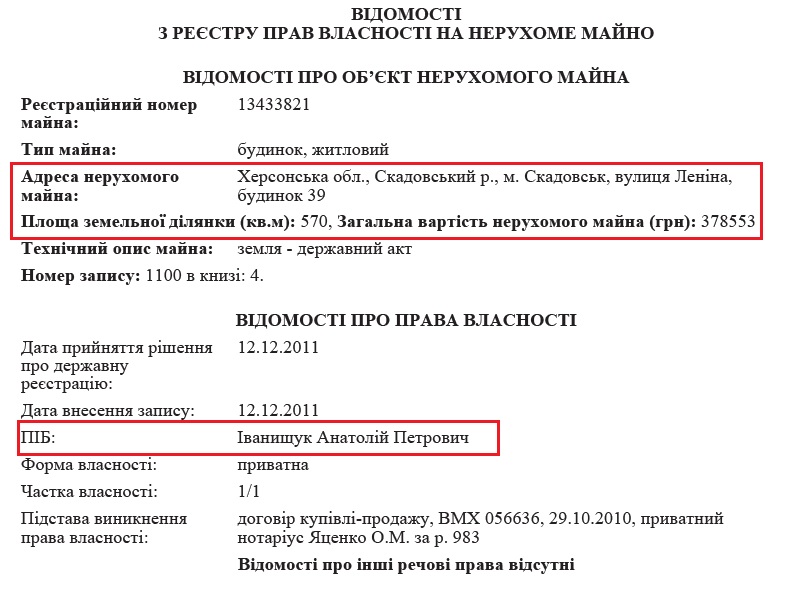 Однак, на сьогоднішній день, за даними реєстру нерухомості, у власності Анатолія Петровича Іванищука знаходиться лише будинок у місті Скадовськ Херсонської області.